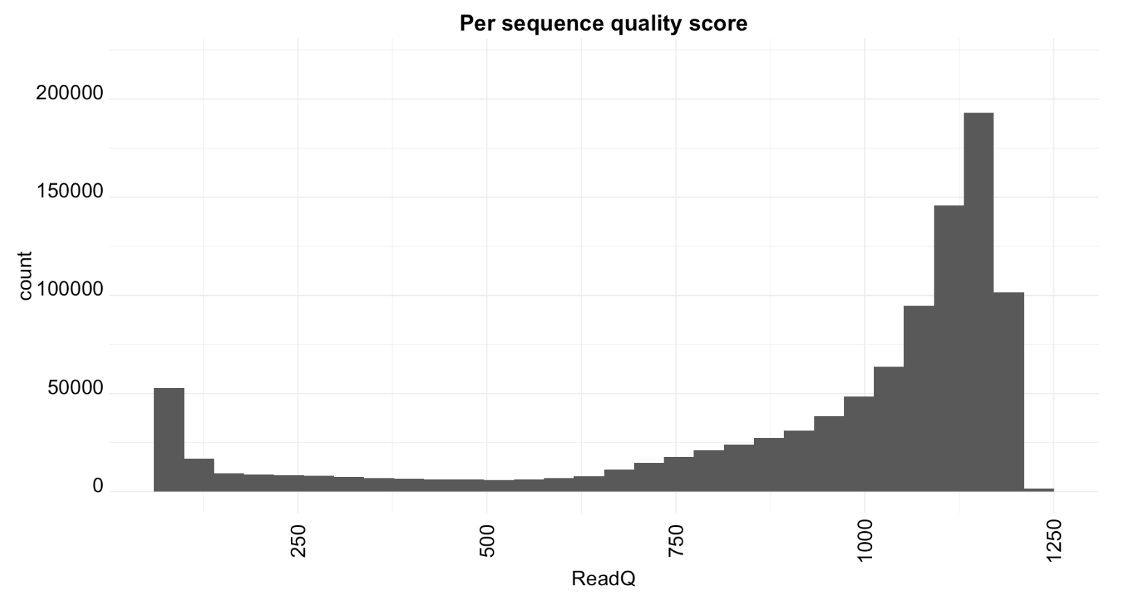 ylim(0, 220000)+ggtitle("Per sequence quality score")