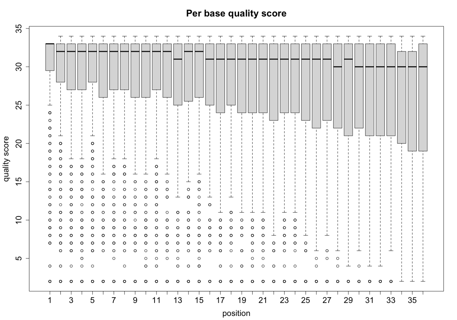 graphics::boxplot(qualAsMatrix[1:1000, ], xlab="position", ylab="quality score", main="Per base quality score", cex.axis=1.5, cex.lab=1.5, cex.main=1.75)
