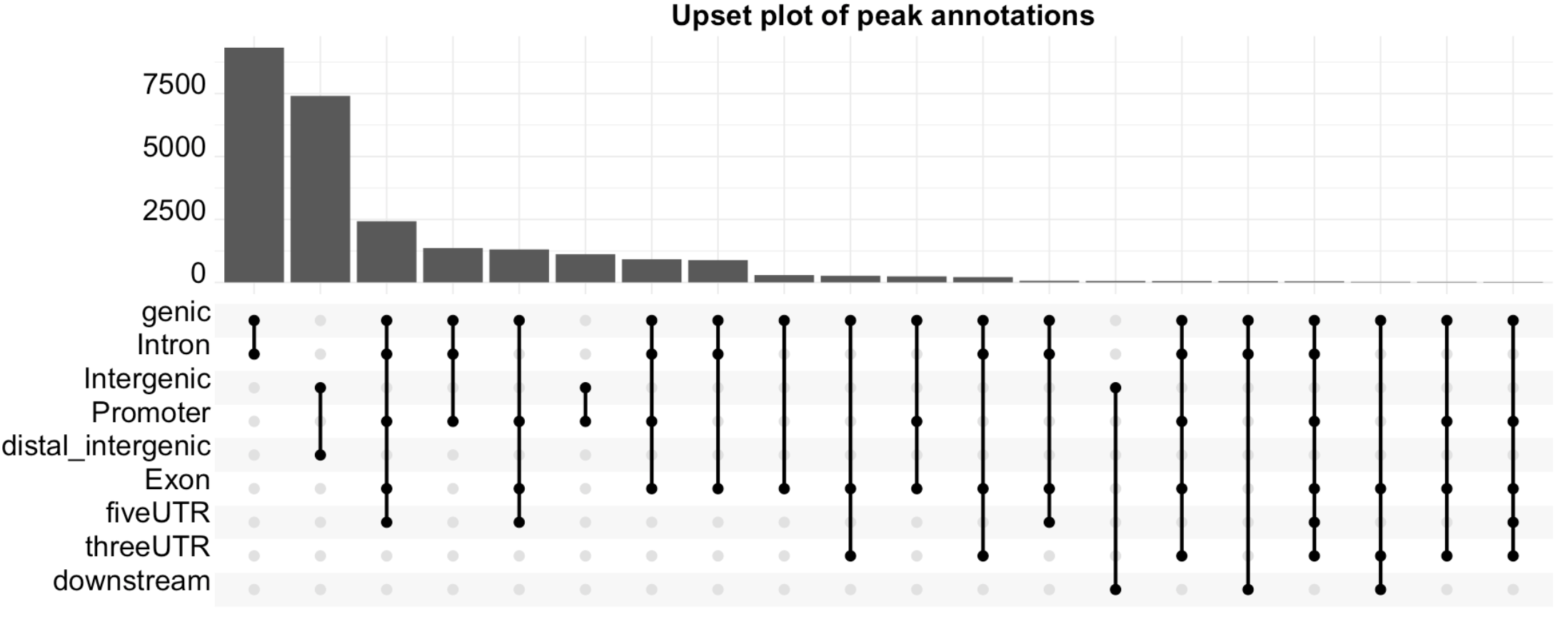 upsetplot(peakAnno, vennpie = F)+theme(axis.text.x = element_text(color = "black", size = 20, angle = 90, hjust = .5, vjust = .5, face = "plain"),