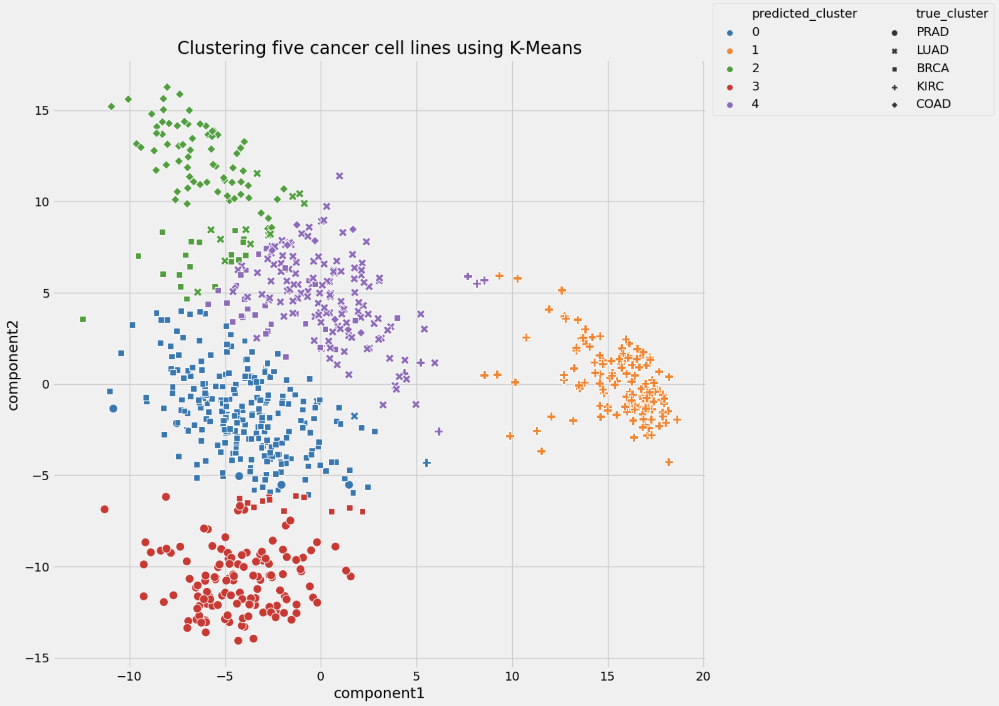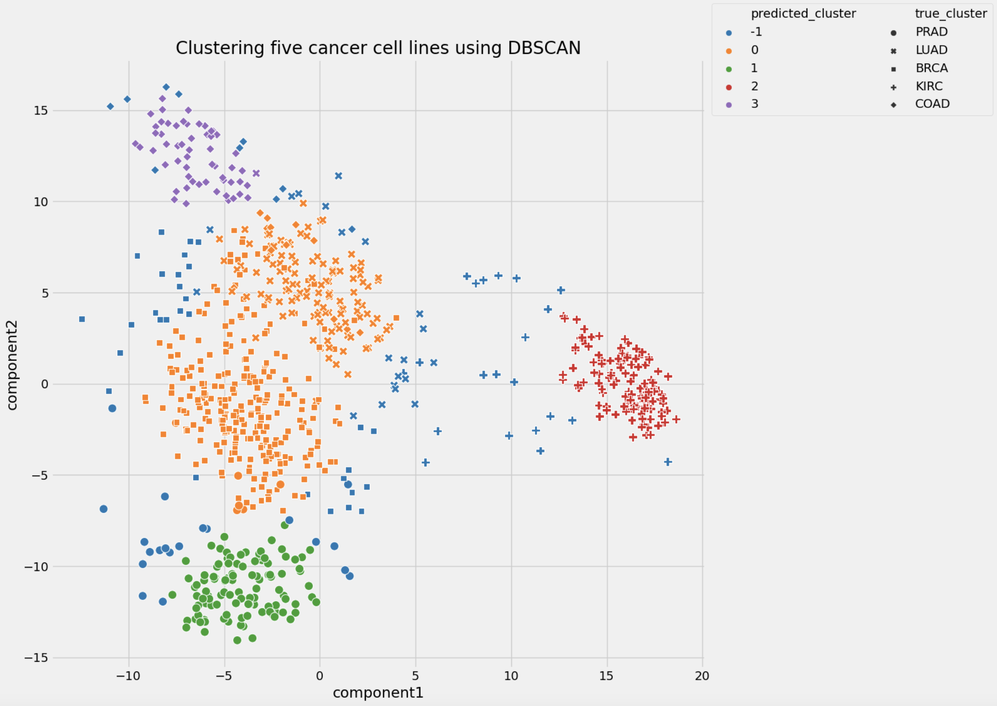 Conclusion: K-means and DBSCAN algorithms were used to separate analyzed cancer cell lines into clusters based on gene expression signature. The k-means algorithm showed a better performance in comparison with the DBSCAN algorithm: